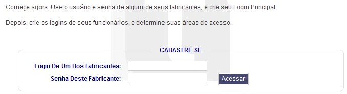 O Cadastro é iniciado com o login e senha de qualquer Fabricante.