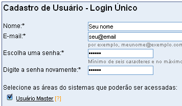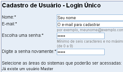Para cadastrar o usuário principal, devem-se preencher todos os campos obrigatórios ( Seu nome, endereço de e-mail válido e a senha de acesso ao Login único, que deve conter obrigatoriamente letras e números), E ativar a opção de Usuário Master logo embaixo.