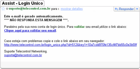Após o envio dos dados para o cadastro do usuário, este irá a receber na sua caixa de entrada do e-mail fornecido uma mensagem de confirmação, que serve para validar ou conferir o e-mail informado.